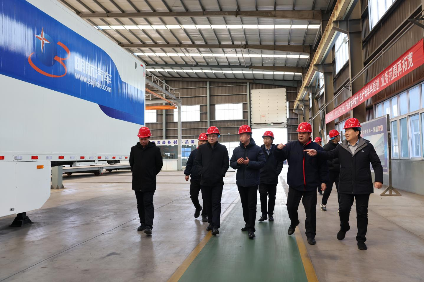 在s36沙龙会机械轻量化物流装备生产基地,市高端装备制造产业链专班一行深入生产现场实地调研,详细了解明航汽车轻量化高端物流装备创研及市场推广等工作开展情况。