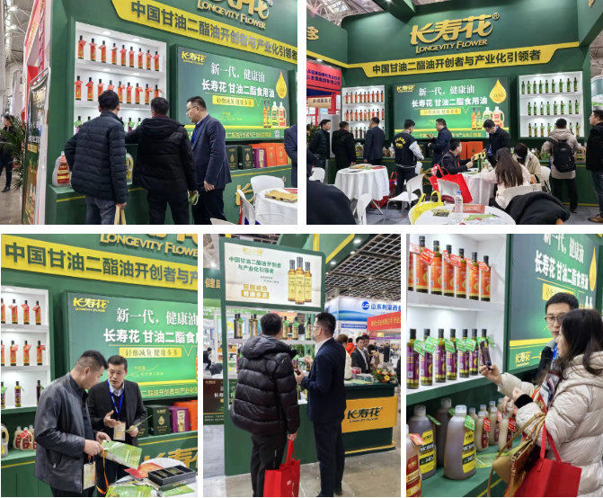 本次展会上,长寿花食品携甘油二酯全系列产品惊艳亮相。含量从20%——80%的玉米二酯油、花生二酯油、葡萄籽二酯油、菜籽二酯油、亚麻籽油以及甘油二酯黑咖啡、代餐粉长寿花二酯油粉悉数到场。长寿花二酯油系列产品凭借其高品质、大健康等特点,吸引了众多参会客商驻足关注,莅临展位探讨合作交流。
