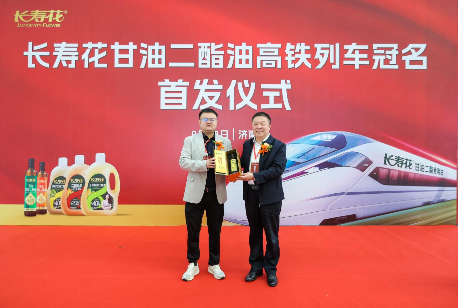 长寿花食品股份有限公司董事长、总经理王明星,副总经理、营销总监任在顺,甘油二酯油事业部总监明天,高铁合作方领导等嘉宾亲临现场,共同见证长寿花甘油二酯食用油全新品牌之旅的盛大启程。