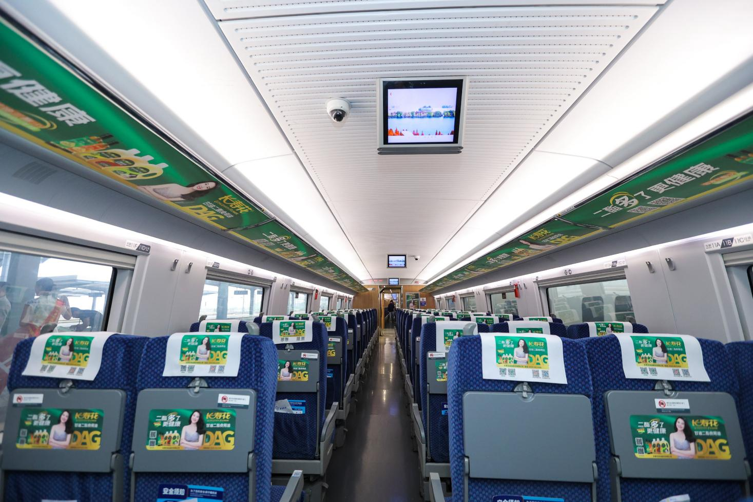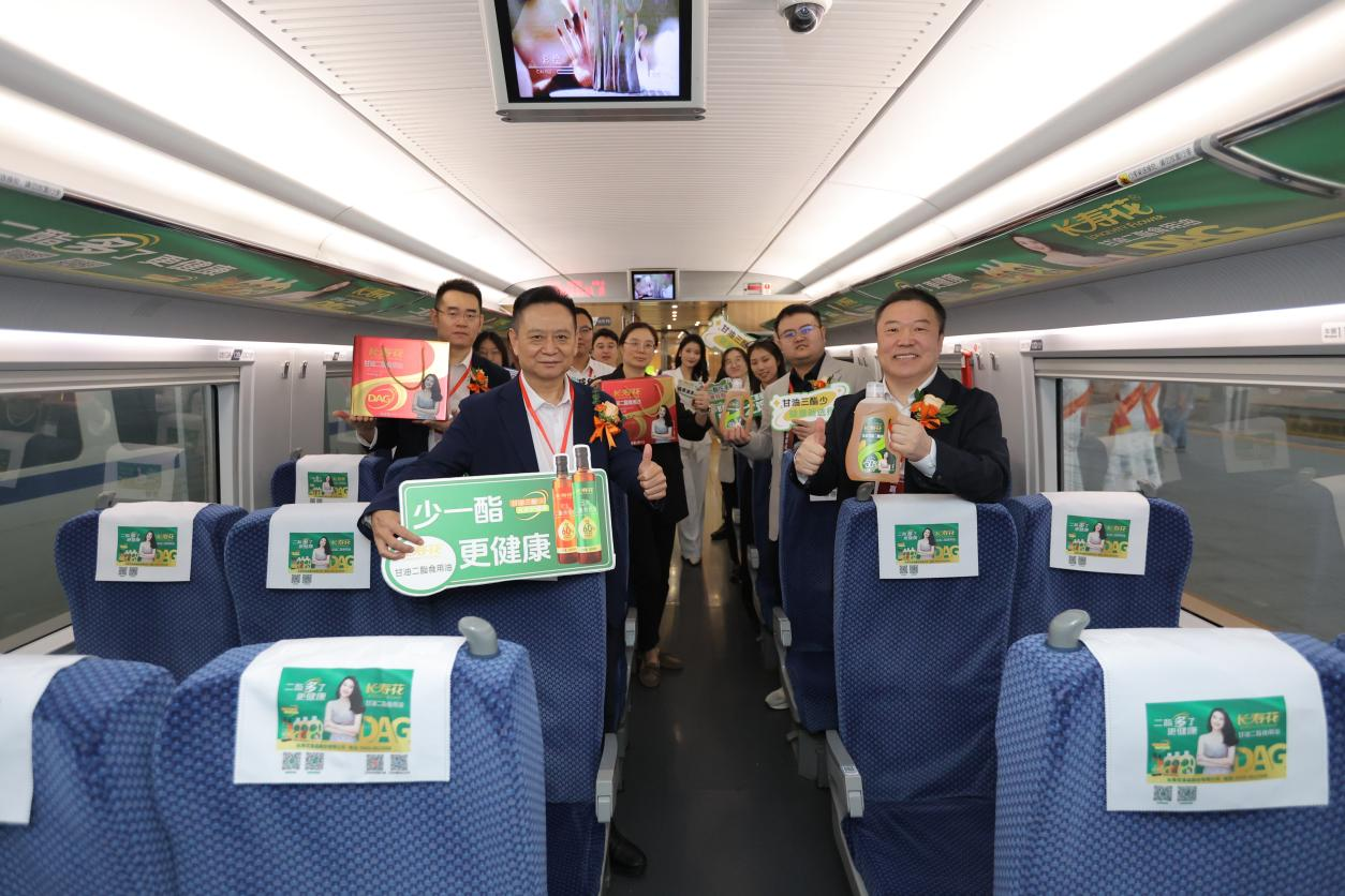 仪式结束后,与会领导一行到达站台,与“长寿花甘油二酯食用油号”高铁列车合影,并登上首发班次冠名列车,实地感受品牌与高铁场景的深度融合。列车内部构建了以小桌板、头巾、行李架、海报、字幕等为点位的品牌传播矩阵,形成360°环绕式品牌空间。