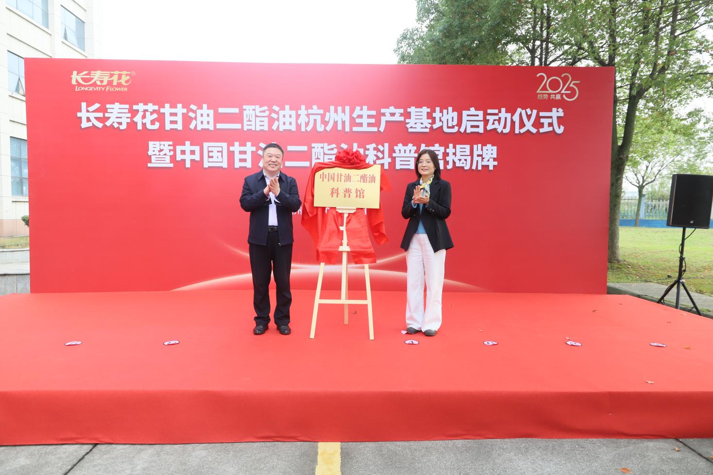 仪式上,桐庐县商务局党委委员、副局长闫娟与长寿花食品副总经理、营销总监任在顺为中国甘油二酯油科普馆隆重揭牌。