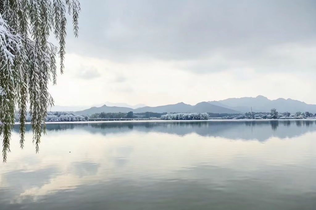 湖畔的枯枝裹着薄雪,偶有寒鸟掠过,留下几声清啼,搅碎了冬日的静谧。脚下的雪被踩出咯吱的轻响,与我们絮絮的话语交织,成了这雪天里最温柔的旋律。她偶尔抬手替我拂去肩头落雪,指尖轻触的微凉,却比掌心的暖意更熨帖心头。那些未曾说出口的惦念,都藏在牵紧的手、细碎的叮嘱里。行至湖亭,并肩倚栏看雪落湖面,晕开一圈圈浅浅的涟漪,就像我们的日子,平淡却总在心底漾起温柔。