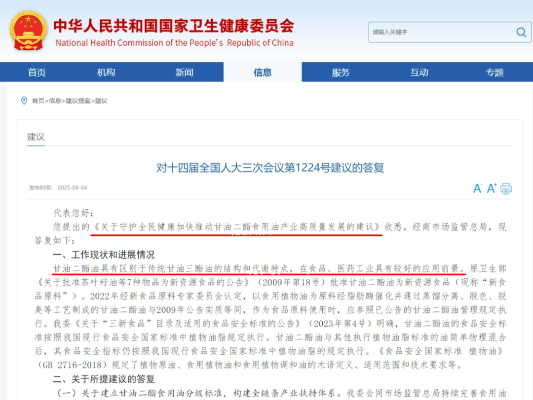 国家卫健委在《关于守护全民健康加快推动甘油二酯食用油产业高质量发展的建议》答复中指出:下一步工作目标和计划,将会聚焦人民健康营养需求和行业发展需要,推动甘油二酯健康效应研究和产业发展关键技术突破,适时推进甘油二酯食用油标准体系建设,加大油脂营养健康科普和指导,引导产业健康发展,助力健康中国战略实施。